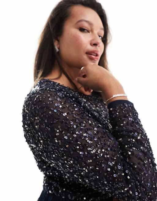 Maya Plus Bridesmaid Long Sleeve Maxi Tulle Dress With Tonal Delicate Sequin In Navy Asos